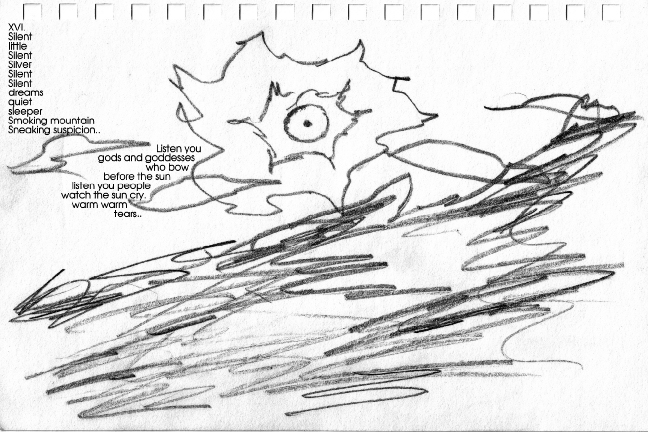 XVI. Silent little Silent Silver Silent Silent dreams quiet sleeper Smoking mountain Sneaking suspicion.. Listen you gods and goddesses who bow before the sun listen you people watch the sun cry. warm warm tears..