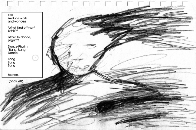 XXIII. And she waits and wonders "What kind of 'man' is this?" afraid to dance, pilgrim? Dance Pilgrim *Bang, Bang* Dance! Bang Bang Bang Silence.. (and i left)